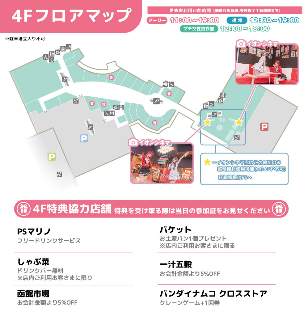 衣装を着用した状態でご来場された場合、受付にて正規チケットとの差額を追加料金として申し受けます。 - プチ更衣室は1回の入室につき20分間ご利用いただけます。