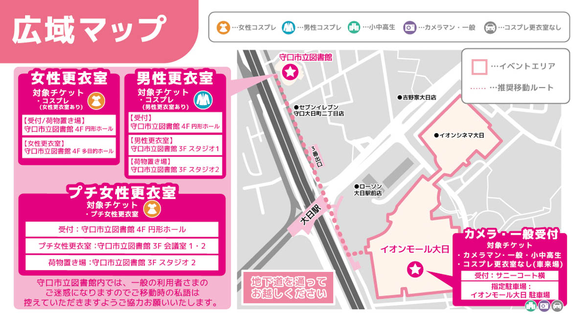 過度なメイクのコスプレをする場合は、「更衣室ありチケット」または「更衣室なしチケット」でご参加ください。 - お荷物はなるべく手荷物やリュックなどコンパクトな状態でご来場ください。